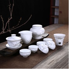 艺创 定窑白瓷手绘山水整套功夫茶具 盖碗 茶杯套组