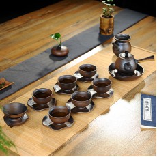 艺创 手工制作粗陶柴烧整套功夫木柄茶具 陶瓷 侧把 壶承礼盒