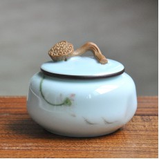 青瓷手绘荷花陶瓷茶叶罐 储物罐 瓷罐 收纳罐